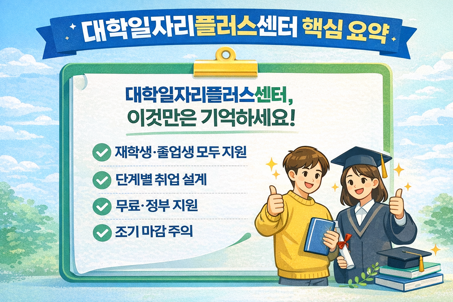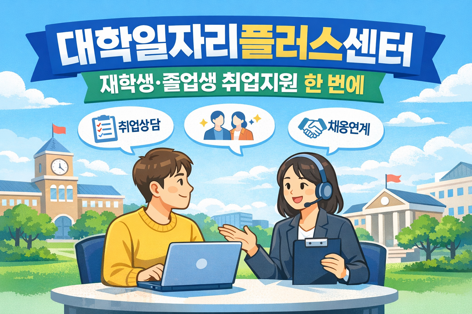 이처럼 대학일자리플러스센터는 취업을 준비하고자 하는 청년 모두에게 취업 준비를 체계적인 방향으로 이끌 수 있도록 도와주며, 단계별로 실질적인 성과를 높이는 가이드가 되어주는 제도입니다.